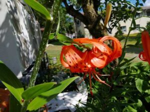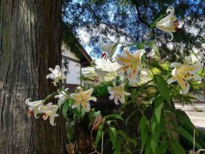 お食事処ばっきゃ大糸杉の坪庭。山百合と大岩。手水鉢の様に凹みのある庭石。山に似ている風景なれば、山の花が生きる。御金が”第一”になれば何かを理由に殺傷が正当化。物言わぬ(結いの文化)