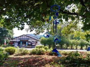 小劇場(妖怪アイスクリーム)準備が進む。東屋を”わったんとおぐちゃん”が掃除している。樹木に付けられた可愛い風鈴。わったんの行く所に楽しさが在る。愛が在る。ユリノキの高木。熱波から守る。