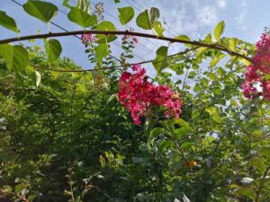 小劇場(旧戦後日本初、アジア公演記念館)庭。大きく育った”ヒロシマのアオギリ”傍で百日紅。ミゾハギ科。花言葉は”雄弁”人間が持つ言葉。人を動かす言葉。不思議な”心のこもった言葉”80年を繋ぐ