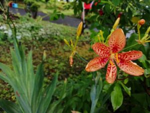 田沢湖ビールさくらホール前庭。ヒオウギ(アヤメ科、漢方)花言葉は”誠意”。美しい花は漢方。身近な屋敷花、野の草花も漢方。1日に5回”お祈り”する国。感謝する心。立ち止まる心。掌に零れる愛。