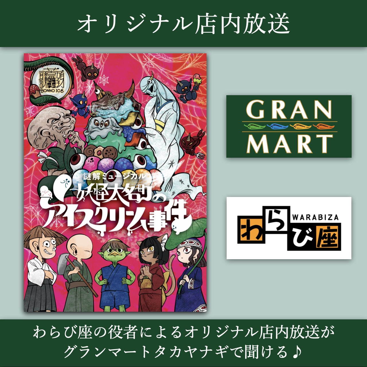 謎解ミュージカル「妖怪大名町のアイスクリーム事件」の紹介アナウンスが8月8日(金)から19日(火)までグランマートタカヤナギの全店舗で放送されます🌈