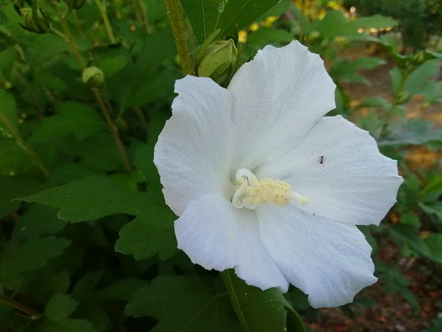 総務(旧研究所)庭、槿の生垣。庭師は剪定をする時、(花芽)を見る。その樹木は何時?花芽を作るか?四角に、円形に色んな剪定法が在るけれど知らなければ花が咲かない。槿は上へ上へ成長する。