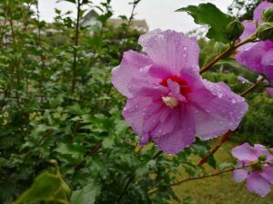 槿の八重!雨の後雫を落とす(十力の金剛石!)何て感性なんだろう。雨を受けて大地も草花も深呼吸する”治水”と言う言葉。ただ防御するのではなく、逃し治める。江戸の工法。恵みの雨、祈りの夏。