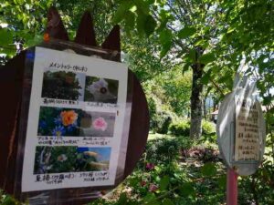 小劇場庭(旧戦後日本初、アジア公演記念館)未来のデータに作った庭表示。祈りの庭。今一番大きく育っている”広島のアオギリ”(わらび座合奏団)が語り部さんから種で頂いた。シウリ桜も貴重種
