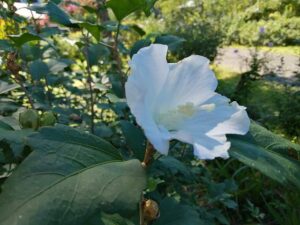 一日花の槿。今年は白が良く咲いている。アオイ科フヨウ属。夏の茶花に欠かせない。花言葉は(尊敬)。”病(いたつき)の故にも朽ちん命也、実りに棄てば、嬉しからまし”賢治辞世の句。1つの命