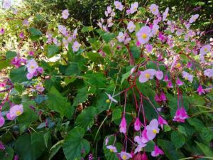 社宅(海つばめ)から秋海棠を小劇場(旧戦後日本初、アジア公演記念館)庭雨溜まりへ植えて見た。多年生草本球根植物。中国から渡来し自然化した。木陰に美しい”秋の色”!花言葉(自然を愛する)