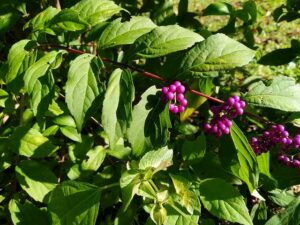 花の苗を買わずとも一本の花木が種を落とす。雨を受け風が吹き土が溜まった場所に発芽する。あれ?用水路の中に(紫式部)!バイカウツギの間に紫を入れる。シソ科、日本原産。花言葉は(聡明)