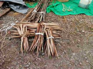 角館武家屋敷!屋根を補修する若親方。補佐する人たちが材料を見せてくれた。山から切り出すコナラ材。乾く前に形を作る。80代の親方から継承した茅葺職人!1つ1つが伝統の技。強度と理屈。