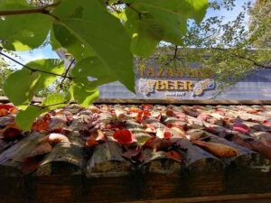 田沢湖ビールさくらホール前庭。”28期記念樹桜”下にミニログハウス。休み明け見ると必ず中の状態が変わっている。遊んでいる子供たちが見える。屋根上の紅葉。桜は一枚でグラデーション!美しい。
