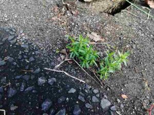 春から雨が降ると田沢湖ビール正面アスファルト道の草を取っていた。時間が経つとアスファルトの割れ目に土や砂。入った種が発芽する。酷暑の夏。雨の日だけは少し涼しい。あれ?芝桜が発芽してる。