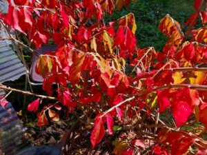 作業場鉢植え。もう錦木のみ。全て地植えした。自分が居なくなった(わらび座)を考える。石組みから芝桜が育ち滝の様に枝垂れる。大切な場所には薔薇が咲いている。自力で生きれる様配置する。