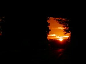 (霜月の陽は、早暮れて、白鳥の声も聴こゆ、この地で生まれ、この地に生かされ、良くぞ秋田に生まれけり)鶴瓶落としの夕日。シャッターは一瞬。庭の玉散らしを終え下草を取る。御客様の人生、旅。