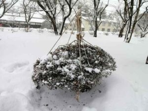 重い雪に餅躑躅(もちつつじ)の雪吊りが傾く。毎年(これだけ)が❓傾く。雪を掘り、縄を補強しながら”どうしたら”倒れないか観察。中心に対し玉造に刈り込んだバランスが倒れた側に寄っていたか。