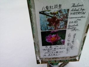 遊歩道は、毎日誰かが歩いて行く。ビール工場スタッフが朝一道を付けてくれる時は安心。そうで無い日は、足で踏んで一本の道を付けて行く。途中の八重紅枝垂れの表示にも通路を付ける。内館牧子さん
