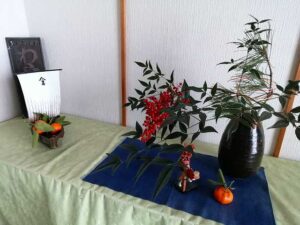 総務玄関。年末はいつもと違ったから書初めが無い。庭から松と南天、水引きで正月飾りを作った。年を越して、頂いたミカンを飾る。皆が元気でお腹を空かさないで暮らせると良いな。豊かな北前船!