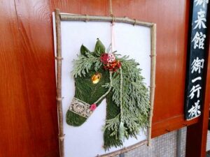 お正月ホテル前看板に飾って合った美しい”馬”のアレンジ。ヒノキの裏表、常緑の葉。枝。樹の性質を知らなければ、このアレンジは不可。誰が作ったんだろ?山口ガーディのお母様!庭に薔薇をくれた。