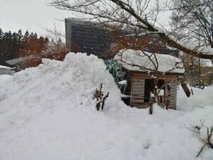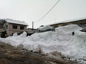 あらぐさ寮沿いに駐輪場。長い屋根、重い雪。雨予報を見越して梯子を掛けて、(尾根切)をして置いた。昨日の雨で一気に尾根が切れ雪氷の塊が落下。切る時は”足元の雪を残す”決まり。命を守る。