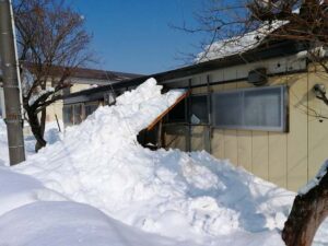 社宅には特別な名前(海つばめ!)数年前に毎年汲取り業者さんが1m落下雪を掘らなければ入れない場所に屋根を付けて見た。スライドして来る雪。これは3年前の2月。今は更に氷の雪が屋根に在る。