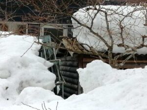 うあああ!ゴーシュの水車小屋があ‼必死の冬季除雪作業一息付き、太陽光が変わる。ドンドン雪が融け車もスピードを出し始める。注意注意!春が来たら治さなきゃ。重い雪に耐えたログハウス【雨水へ】