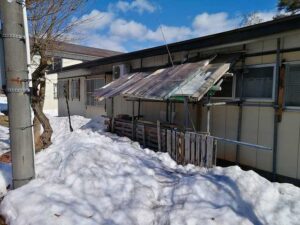 砕け散った屋根を回収、再度組立て雪山のある内に設置。汲取り業者さんが困らない様、付けた屋根。これが無いと毎年落下雪で1m以上の雪を掘る作業に成る。海つばめ。社宅を守る。出来る事をやる。