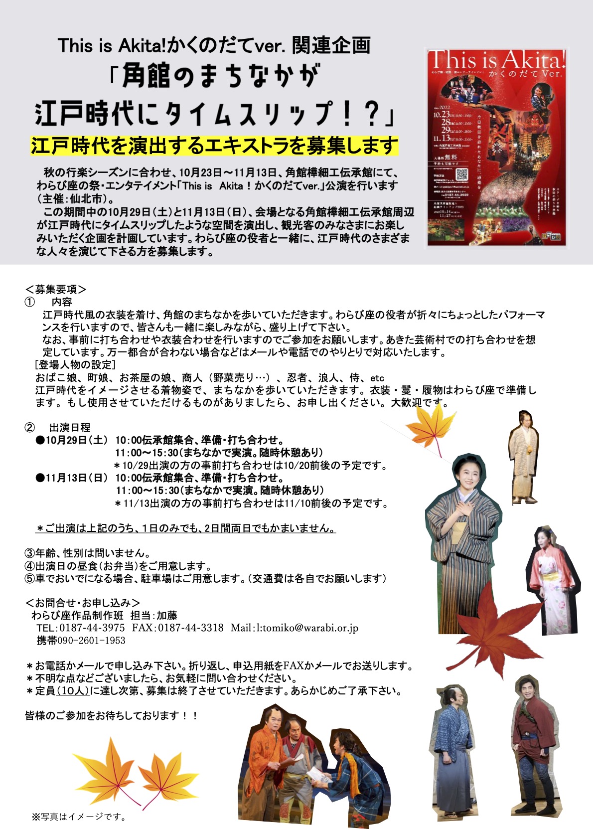 この期間中の10月29日(土)と11月13日(日)、会場となる角館樺細工伝承館周辺が江戸時代にタイムスリップしたような空間を演出し、観光客のみなさまにお楽しみいただく企画を計画しています。わらび座の役者と一緒に、江戸時代のさまざまな人々を演じて下さる方を募集します。