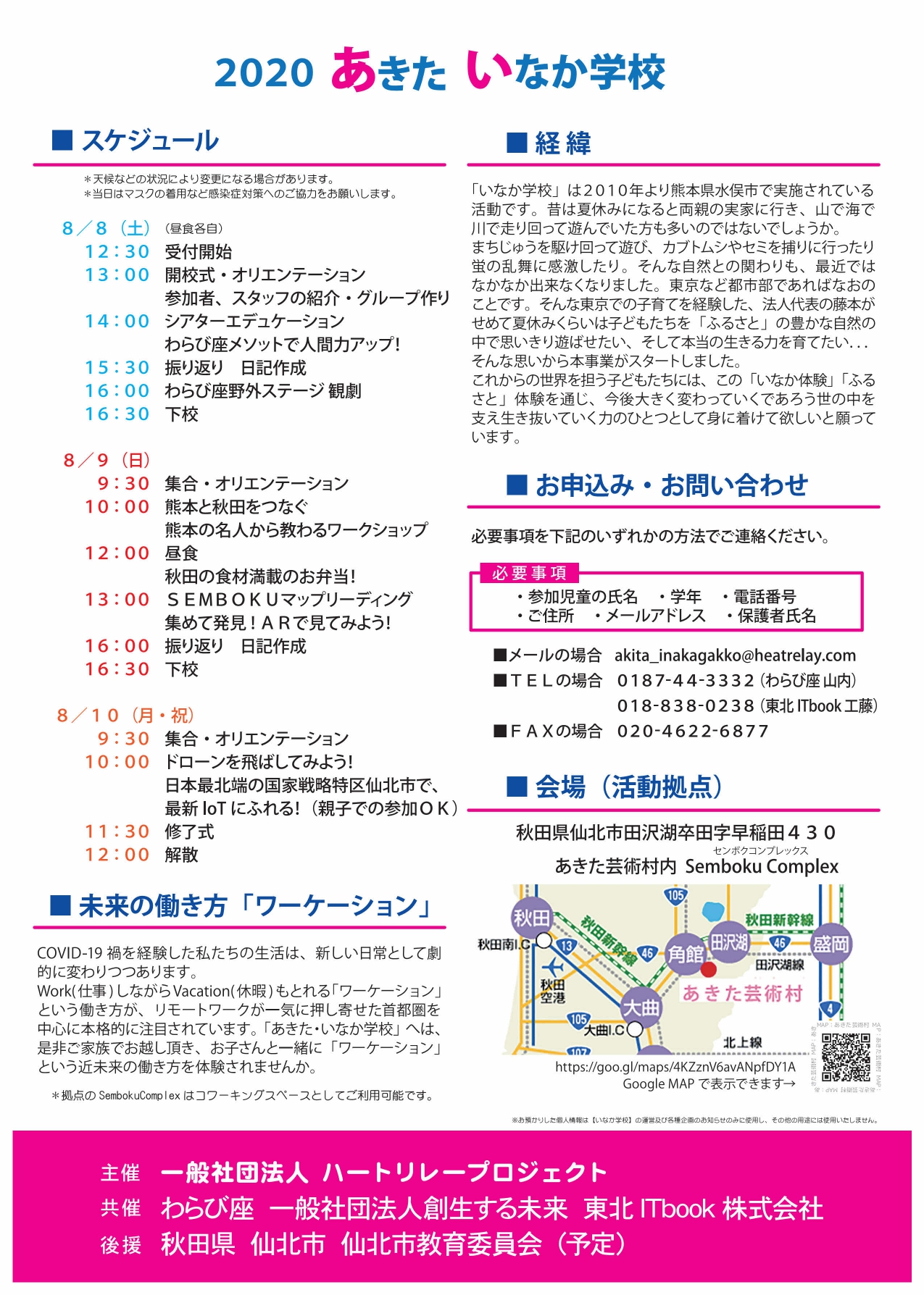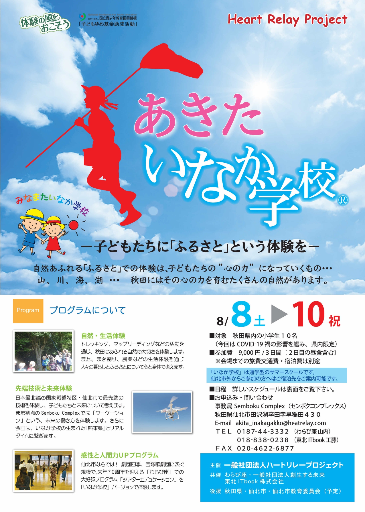 「いなか学校」は2010年より熊本県水俣市で実施されている活動です。夏休みにこそ子どもたちを「ふるさと」の豊かな自然の中で思いっきり遊ばせたいという想いからスタートしたこの事業。今回は、フィールドを秋田に変えての初開催です。わらび座の役者と出会えるシアターエデュケーション(演劇を通じたコミュニケーションワークショップ)や野外ステージの観劇、オンラインで熊本の名人から熊本の果物を使った料理を教わる特別プログラムなど盛りだくさん。また、国家戦略特区である仙北市ならではなドローン体験や、ITに触れプログラミング思考を学ぶマップリーディングにも取り組みます。コロナウイルス感染症対策を徹底の上、参加者を秋田県内の小学生10名に限定して開催します。皆様のお申し込みをお待ちしております。