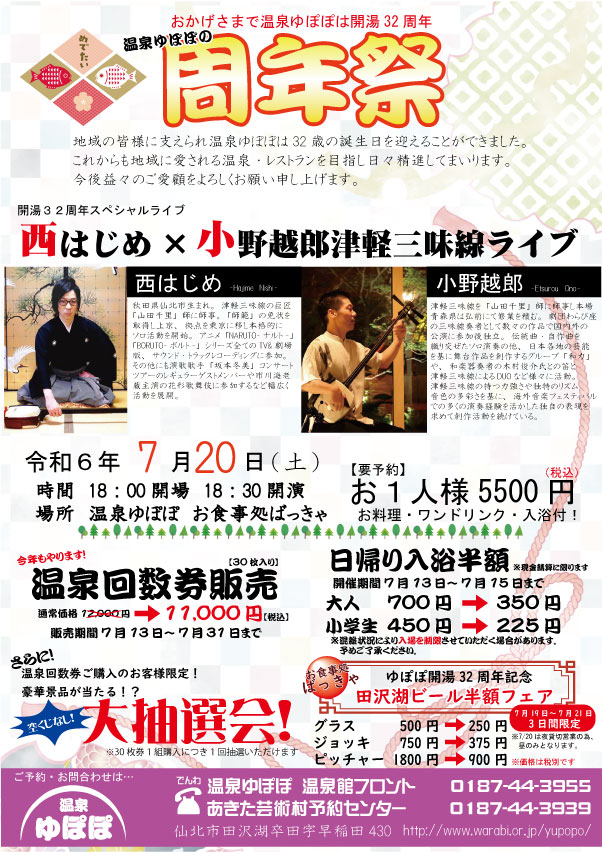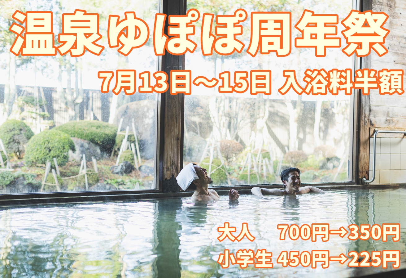 32周年のお祝い企画として日頃のご愛顧への感謝を込め、7月13日~15日まで日帰り入浴の料金を半額とさせて頂きます。