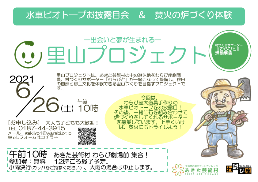 あきた芸術村の中の遊休地を、わらび座劇団員と村づくりサポーター「むらびと」が一緒になって整備し、秋田の自然と郷土文化を体験できる里山づくりを目指すプロジェクトです。