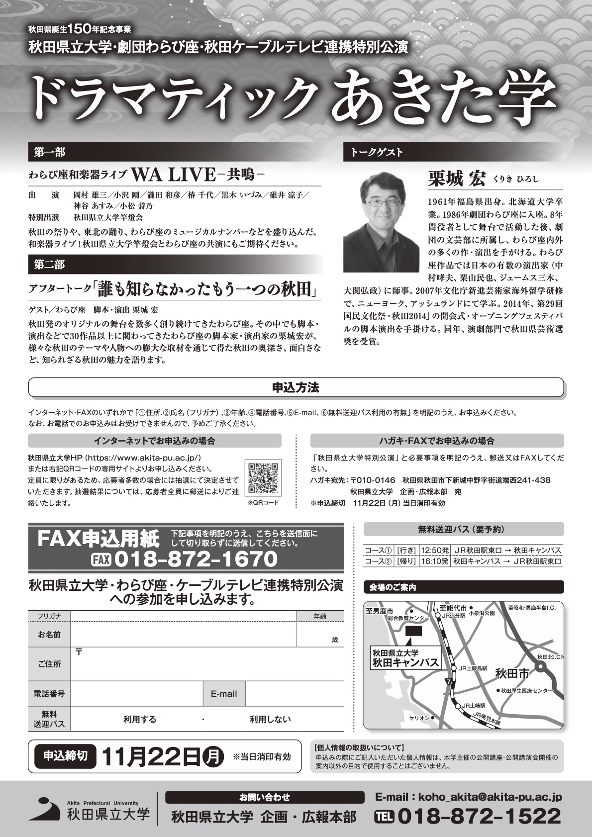 11月28日(日)、わらび座と包括連携協定を締結している、秋田県立大学と秋田ケーブルテレビとの共同実施により、連携特別公演『ドラマティック あきた学』を開催します。