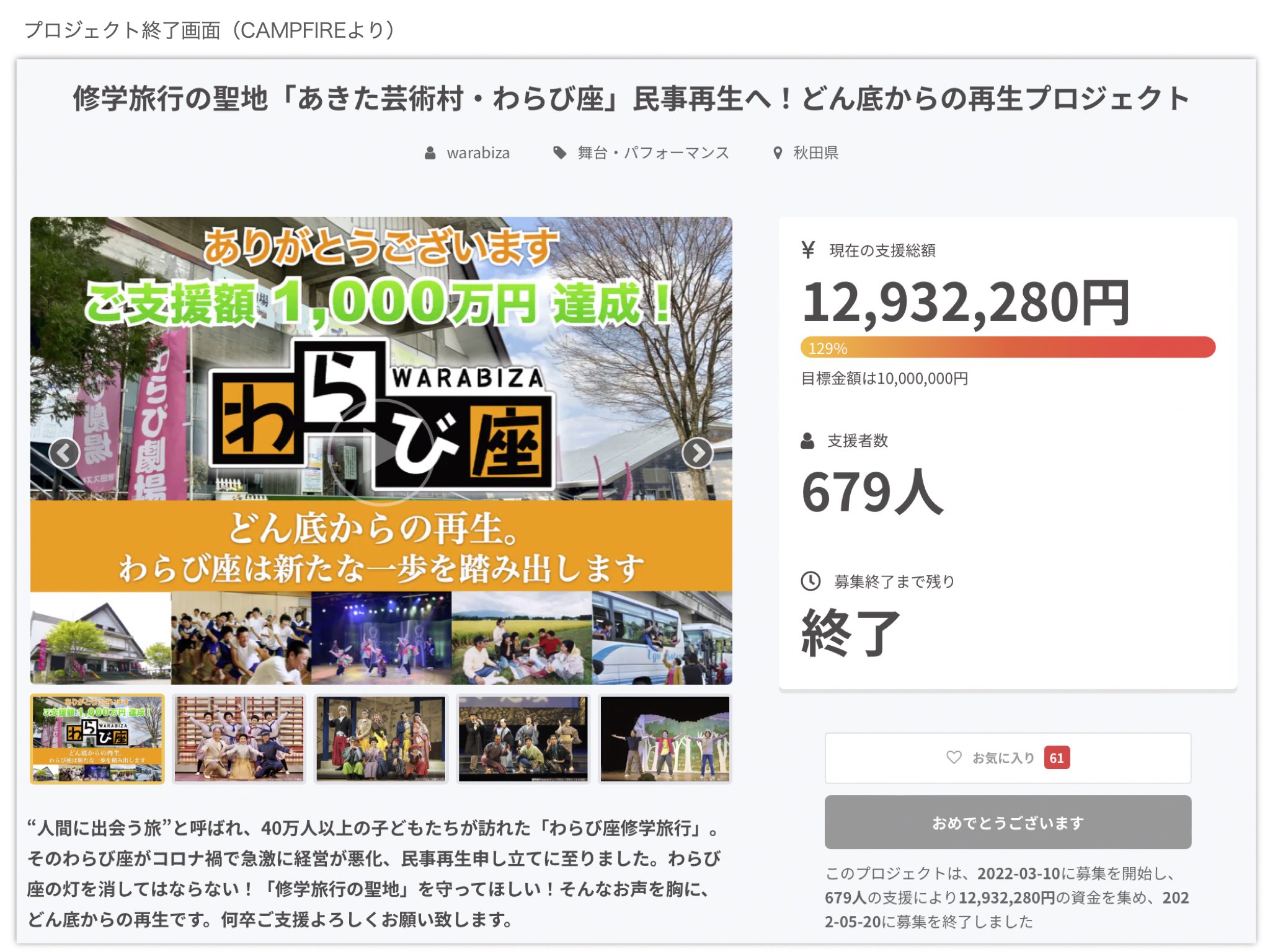 3月10日開始、5月20日終了までに、目標額1000万を大きく超えるご支援を全国からお寄せいただきました! クラウドファンディングの成功をご報告すると共に、多くのみなさまに心より御礼申し上げます。本当にありがとうございました!
