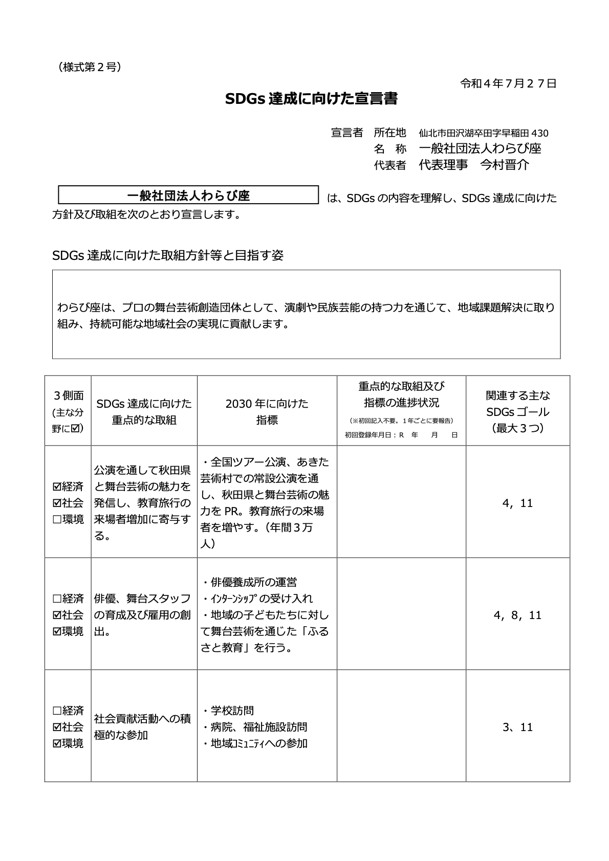 この度、一般社団法人わらび座は秋田県SDGsパートナーとして登録されましたのでお知らせいたします。