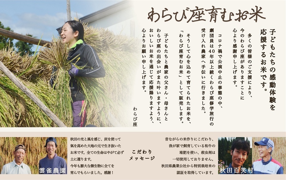 わらび座の役者たちが地域の援農部隊としてわらび座修学旅行の受け入れ農家を手伝い育てたお米です。このお米は、秋田の芸能文化育成や、修学旅行生の農家体験など、心を耕すわらび座の活動を応援するお米です。