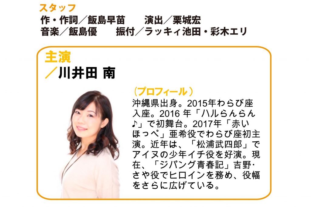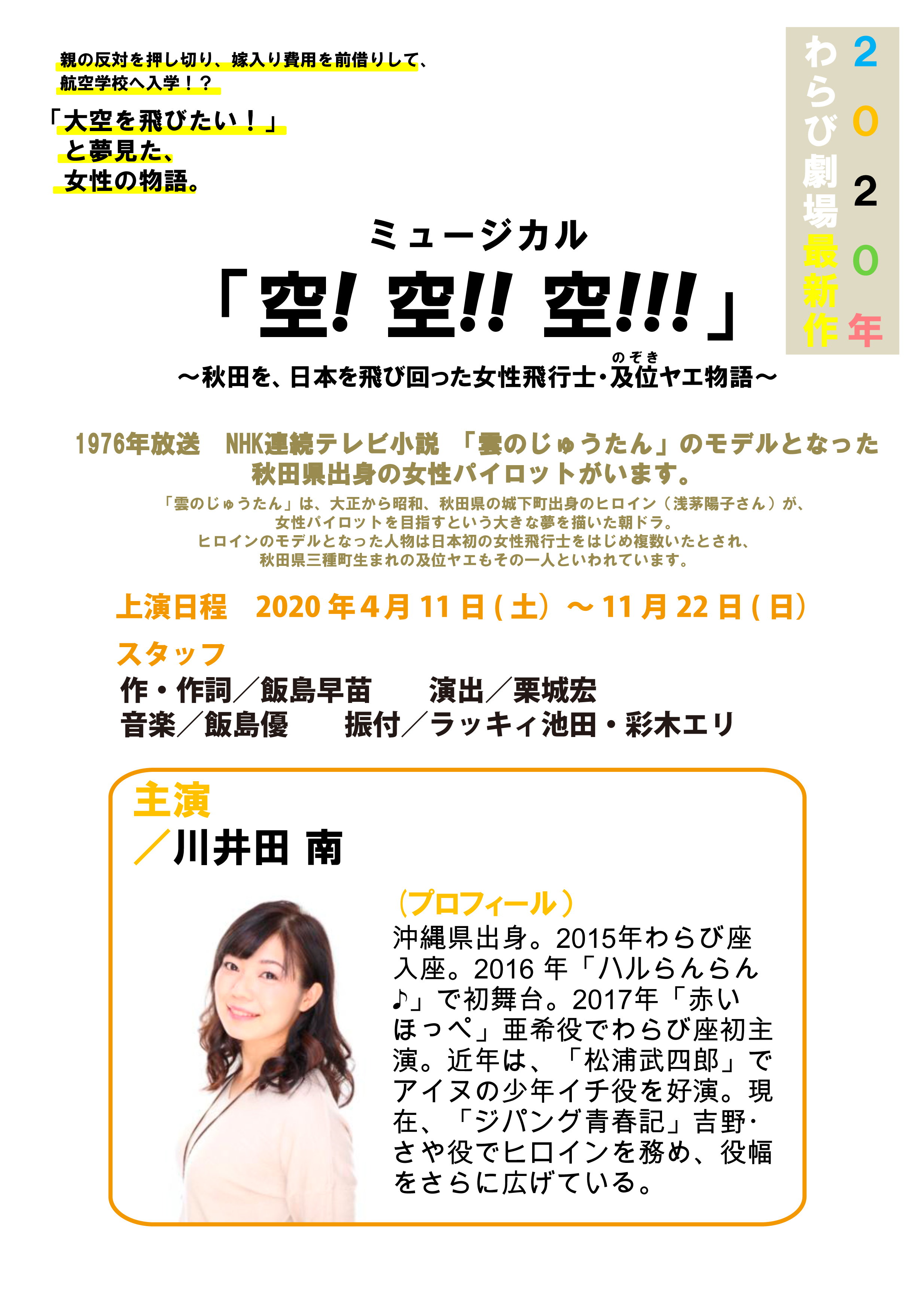2020年わらび劇場新作はミュージカル「空!空!!空!!!」~秋田を、日本を飛び回った女性飛行士・及位ヤエ物語~。主演は川井田南。 2019.11.20 2020年わらび劇場新作のタイトルは、ミュージカル「空!空!!空!!!」~秋田を、日本を飛び回った女性飛行士・及位(のぞき)ヤエ物語~に決まりました。 主演は川井田南。川井田南は沖縄県出身で、わらび劇場公演での主演は今回がはじめて。 スタッフは 作・作詞/飯島早苗、演出/栗城宏、音楽/飯島優、振付/ラッキィ池田・彩木エリ。 わらび劇場での上演は2020年4月11日(土)開幕。11月22日までのロングラン公演の予定です Tweet Share +1 RSS