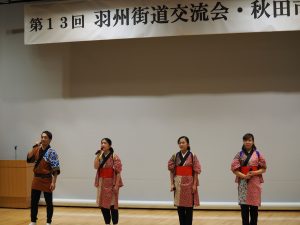 ミュージカル「Run!与次郎!~秋田国造り外伝~」のわらび座俳優4人が、10月19日(土)「第13回羽州街道交流会 秋田大会」のオープニングセレモニーに出演。ミュージカルナンバーの「豊饒の大地」を披露。♪内側は武士のまち、外側にはあきんどのまち、足軽たちの鉄砲町、お寺は・・・と続く歌声が、会場の秋田市にぎわい交流館AU(3階多目的ホール)に参加されたほぼ満員の参加者のみなさんの胸に届いていました。交流会の記念対談「城歩き、まち歩き、街道歩きの楽しさ」のなかでも「Run!与次郎!~秋田国造り外伝~」に話題が及んでいました。