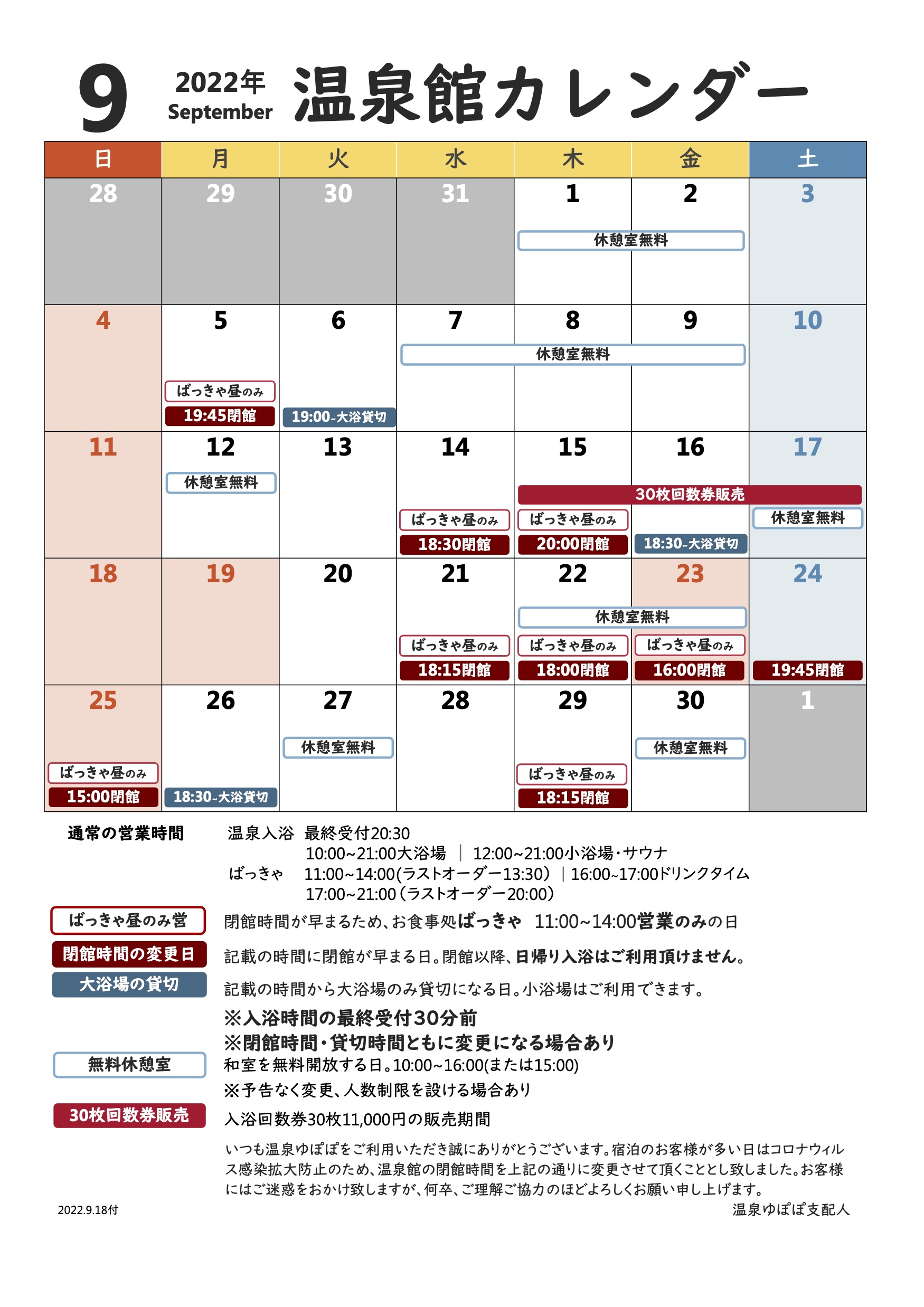 【9月】ゆぽぽ温泉館 貸切・閉館時間変更のお知らせ[カレンダーあり]