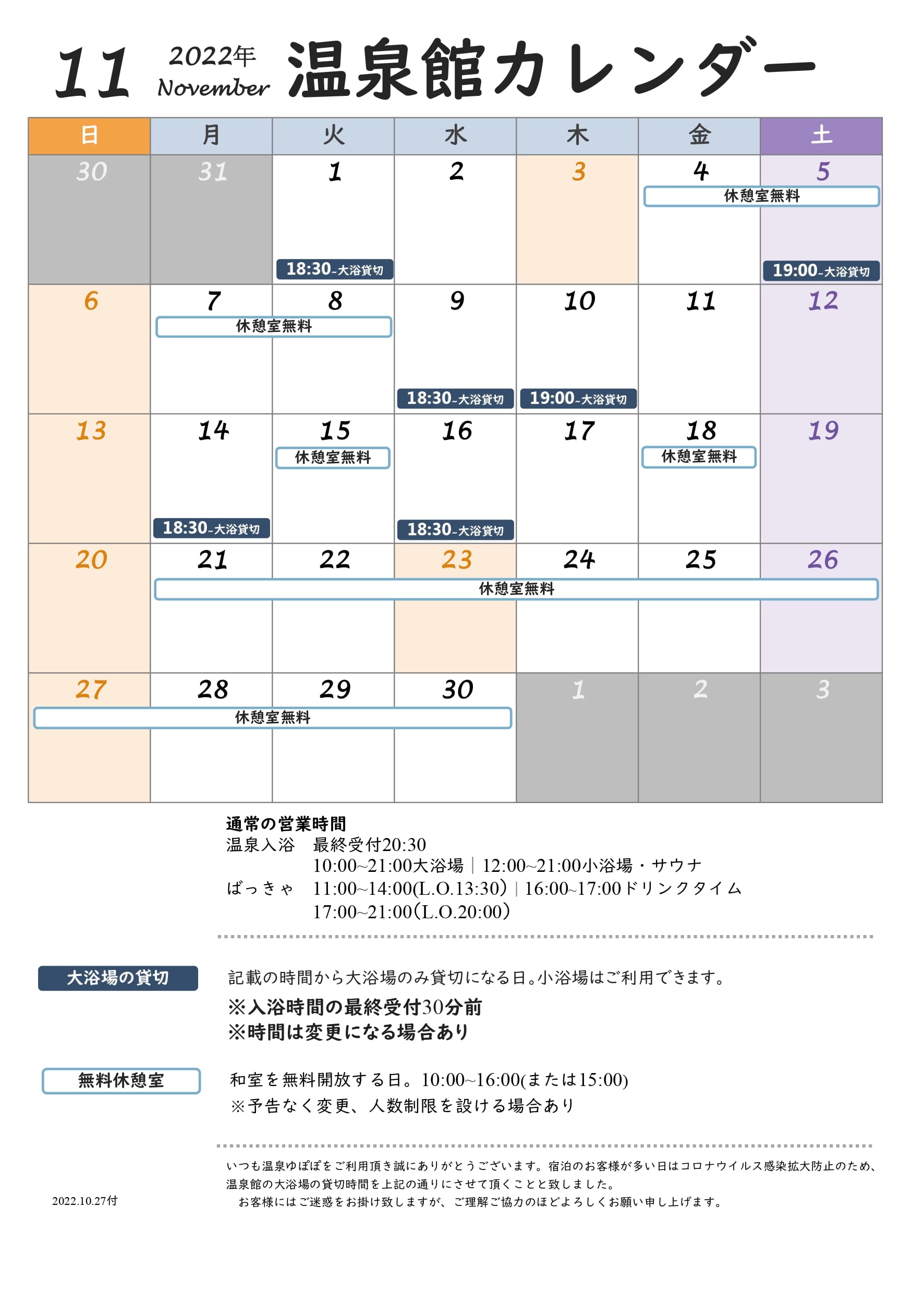 3. 【11月】温泉館 大浴場貸切日程のお知らせ[カレンダーあり] | 温泉ゆぽぽ